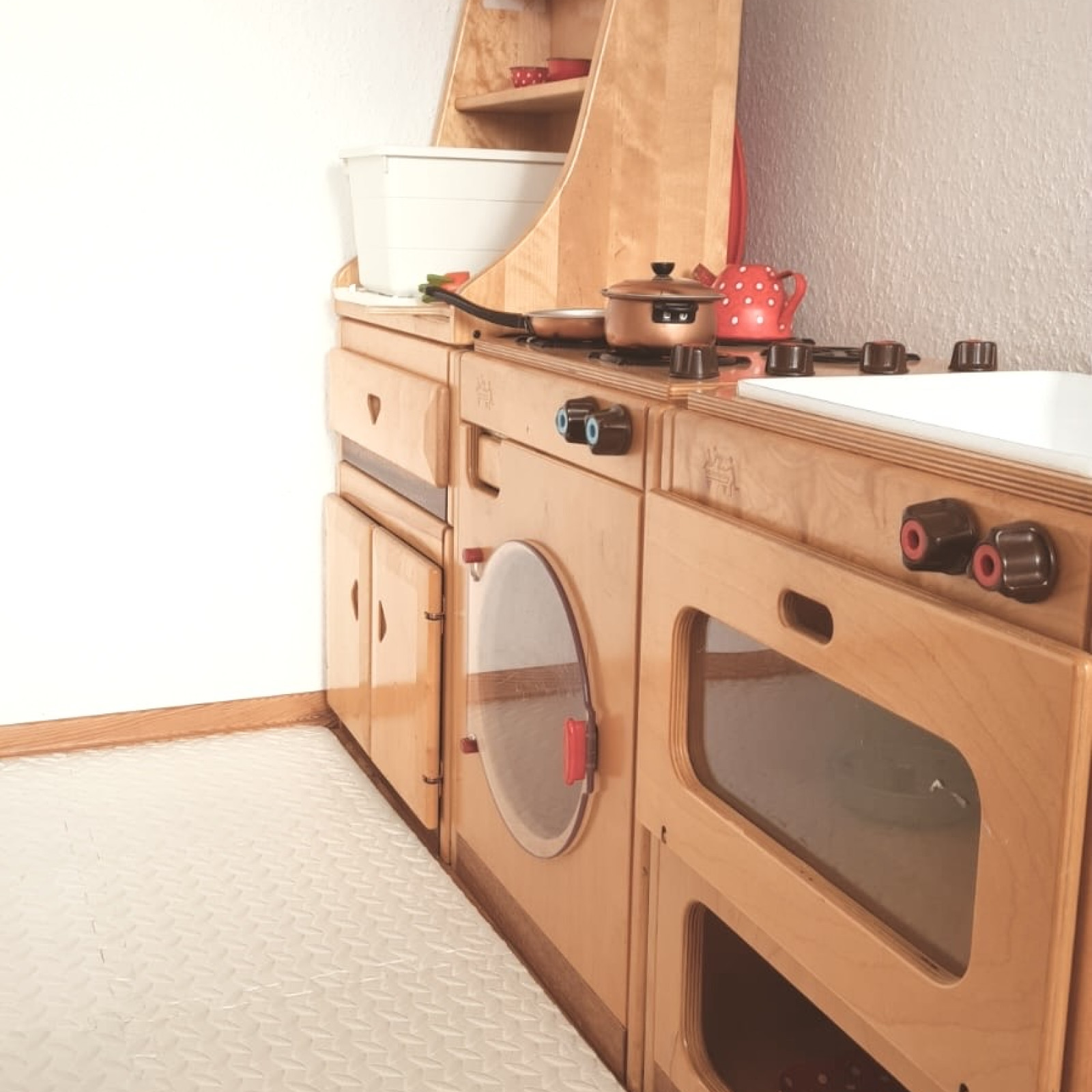 Das Zimmer wurde bewusst in verschiedene Bereiche aufgeteilt. So steht den Kindern ein Kuschelsofa zur Verfügung, ein großer Spielteppich, wo die große Eisenbahn aufgebaut werden kann oder eine große Kinderküche mit Waschmaschine und Herd. Auch ein kleiner Tisch lädt zum basteln und malen ein. Die Kinder haben durch die offenen Regale die Möglichkeit selbst zu entscheiden, mit welchem Material sie sich gerne beschäftigen möchten. Alle Materialien sind dem Alter der Kinder abgestimmt und stehen ihnen jederzeit frei zur Verfügung.